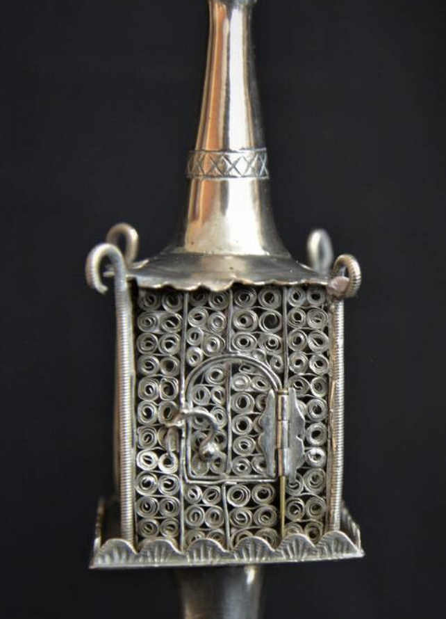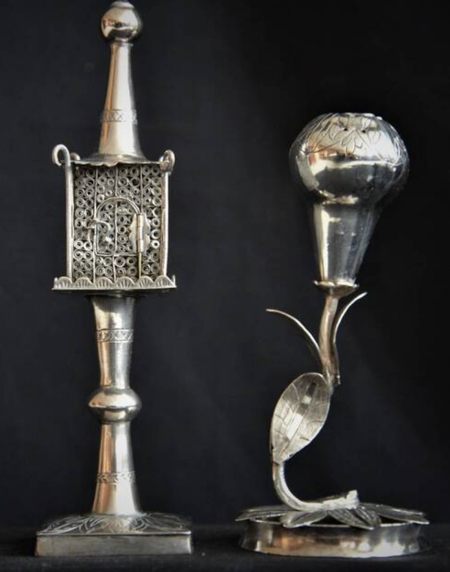The spice box to the right, standing at approximately 13 cm in height, is in form of leaves on a vine, and originates from Russia. It was gifted to the Shaar by Ethel Gallaman, this was a family heirloom of her mother, Mrs. Joseph Gallaman.